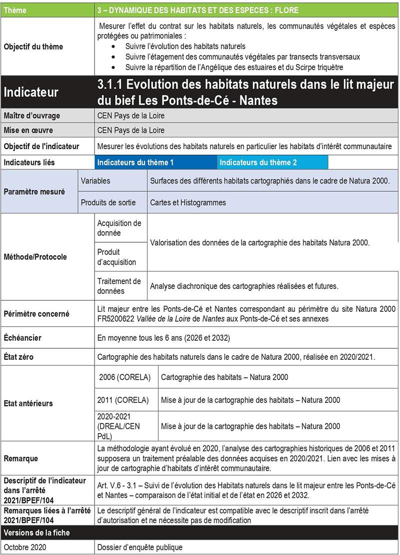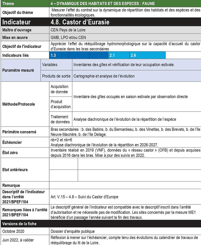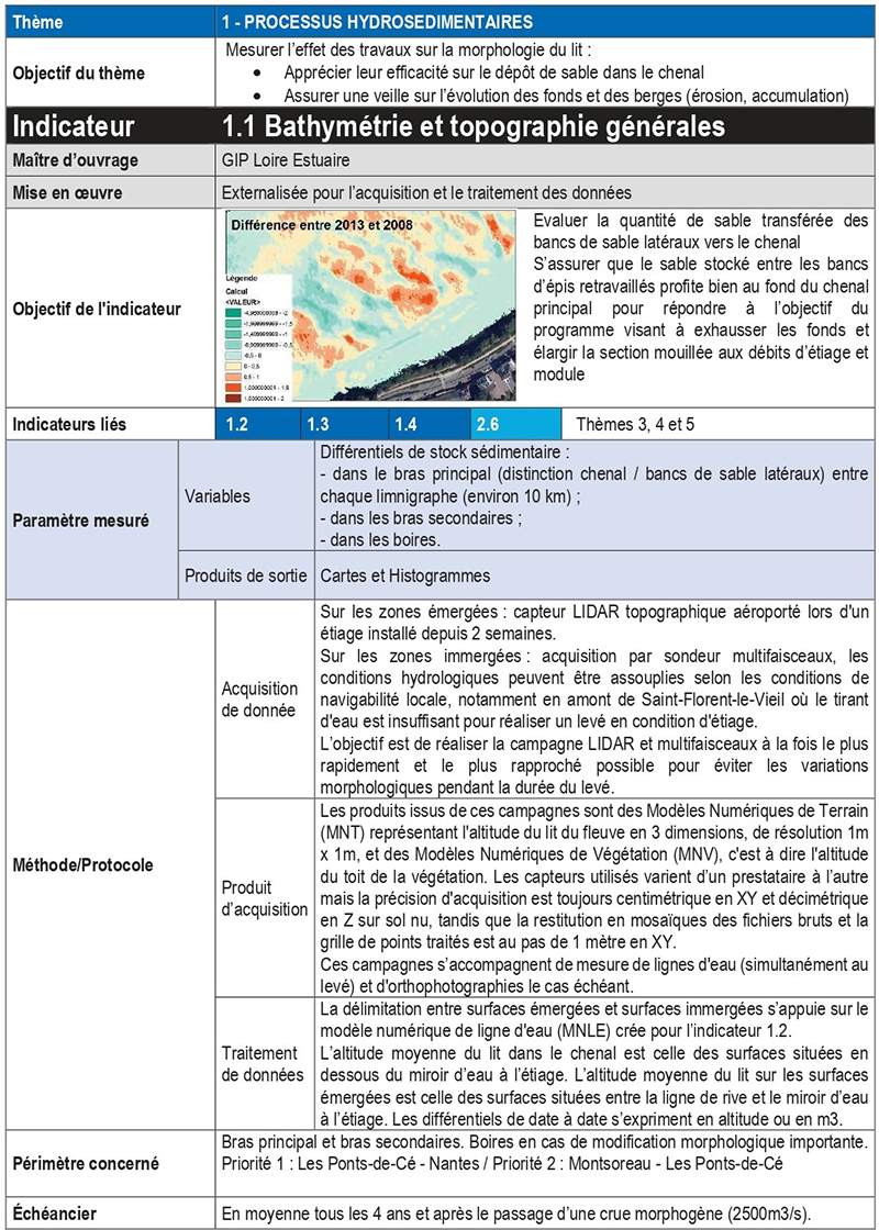 Les différents indicateurs sont organisés de manière transversale et systémique afin de permettre l’interprétation des évolutions écologiques au regard des modifications hydromorphologiques. Une attention particulière est également portée à l’existence d’un état zéro ou avant travaux ; la comparaison des indicateurs avant et après travaux doit permettre de caractériser les effets du remodelage des épis et de l’aménagement de Bellevue et d’évaluer les bénéfices écologiques attendus.