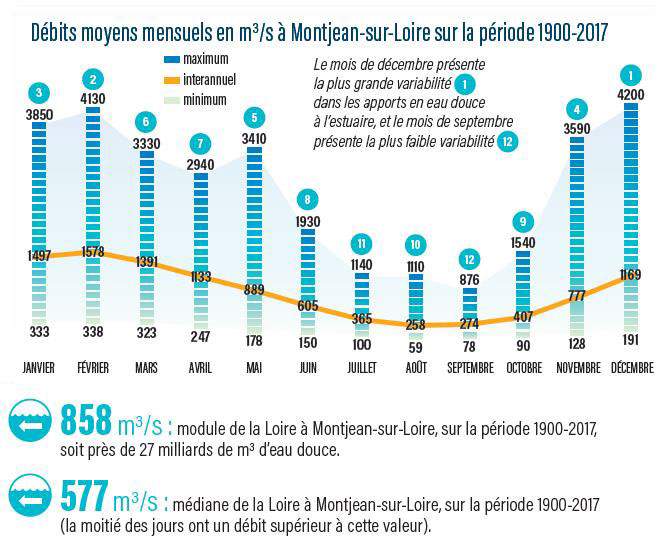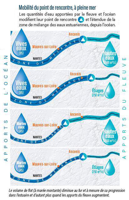 Ces volumes d’eau douce apportés à l’estuaire varient au cours d’une année, faisant varier le niveau de la Loire, en moyenne de 6 mètres en fonction des apports en eau du fleuve. Entre juin et octobre, en période estivale, le niveau d’eau est généralement bas (étiage), il monte ensuite pour devenir important en hiver (crue) et peut franchir la berge pour inonder la plaine alluviale. Mais certaines années connaissent des hivers secs ou des étés humides.