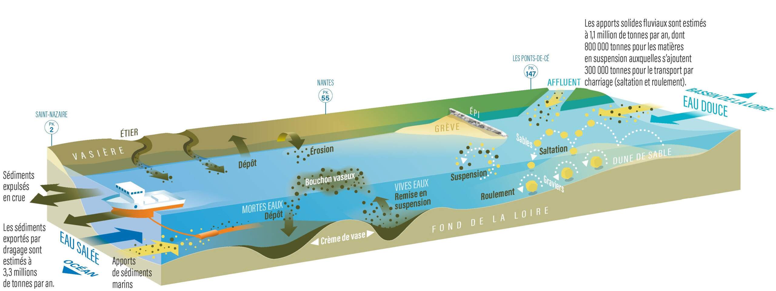 La taille des sédiments dans le lit de la Loire varie d’amont en aval et latéralement, entre le chenal et les rives. Les sédiments sont plus grossiers et sableux en amont, plus fins et vaseux en aval du fait de la présence du bouchon vaseux, présent toute l’année dans l’estuaire et qui contribue à la formation et au maintien des vasières. Il se constitue à l’aval de Nantes et se déplace au gré du débit du fleuve et de la marée ; il est majoritairement détecté à Cordemais, mais il est d’autant plus étendu et volumineux que le coefficient de marée est élevé et le débit faible. Dans ces conditions, il est entraîné en amont de Nantes.