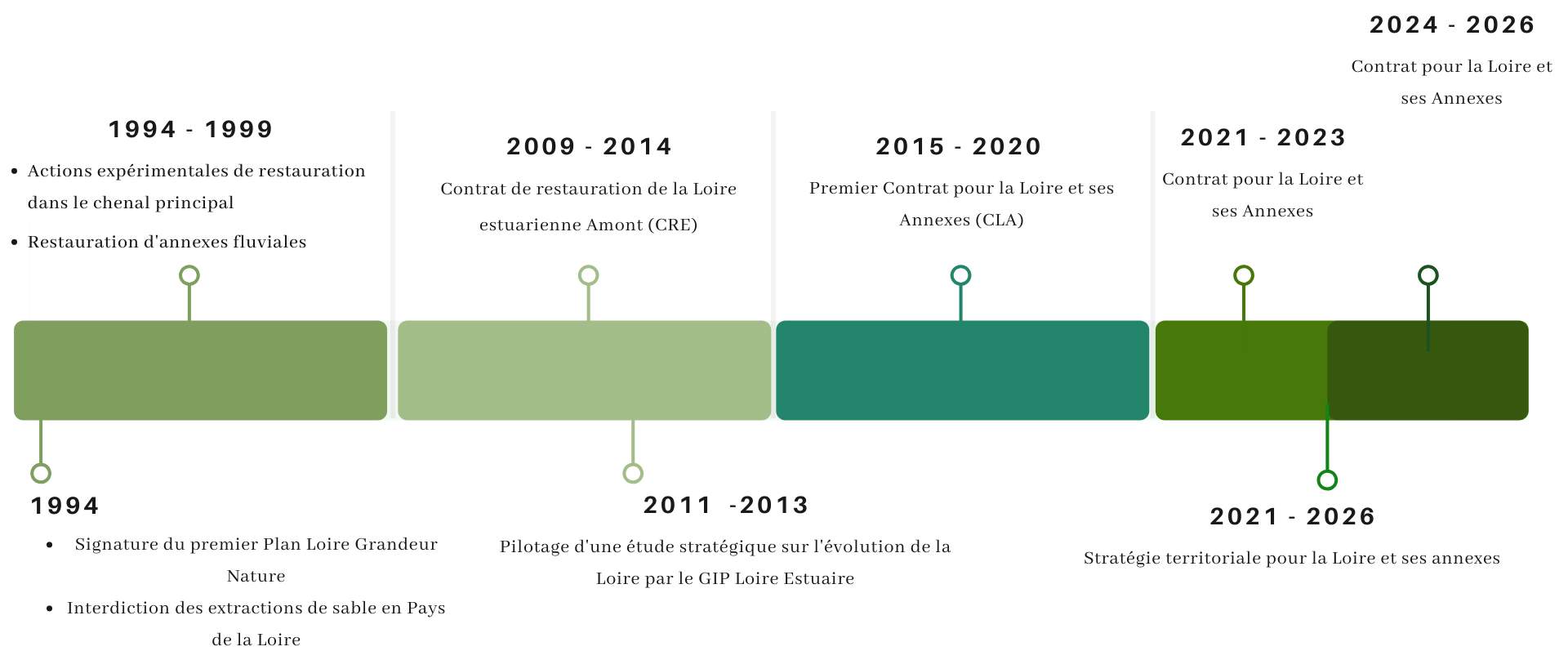 Le contrat pour la Loire et ses annexes découle d’un travail collectif sur le long terme, débuté lors de la mise en place du premier Plan Loire Grandeur Nature en 1994. Cette stratégie territoriale s’est construite en plusieurs temps et regroupe aujourd’hui de nombreux maîtres d’ouvrage, partenaires financiers et techniques autour de la restauration et conservation des habitats de Loire.