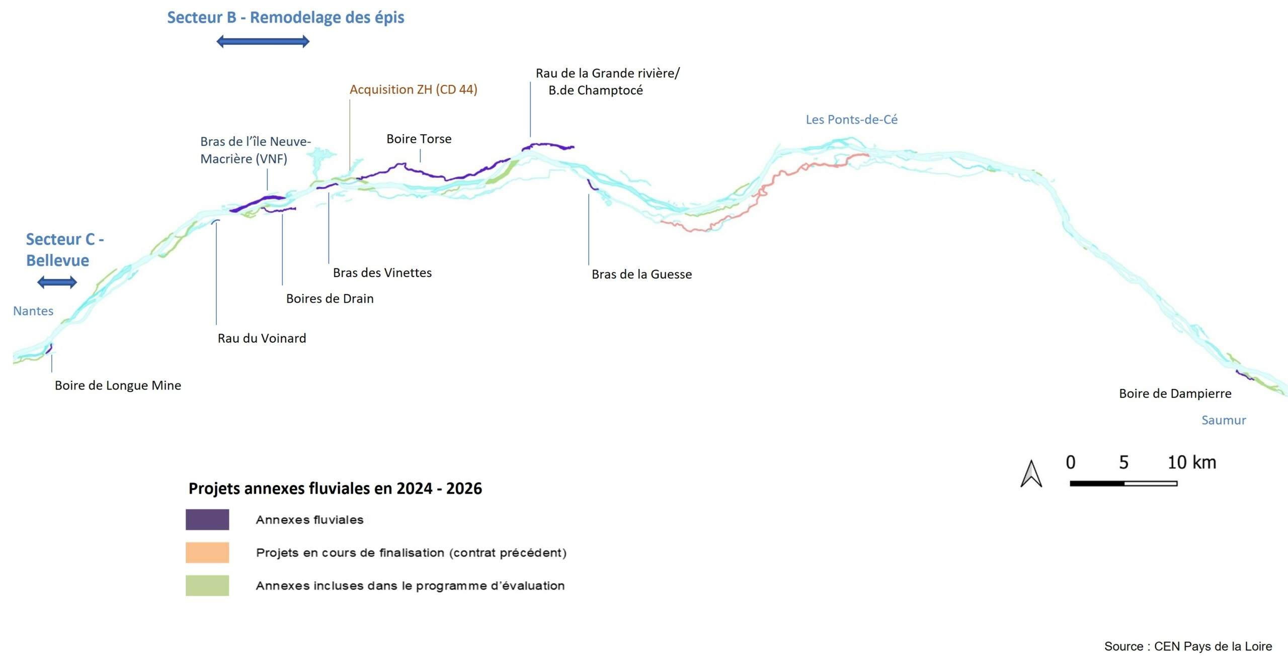 Le programme de rééquilibrage du lit de la Loire porté par VNF constitue le cœur du projet, mais d’autres opérations complémentaires sont aussi menées par les collectivités de Montsoreau à Nantes.